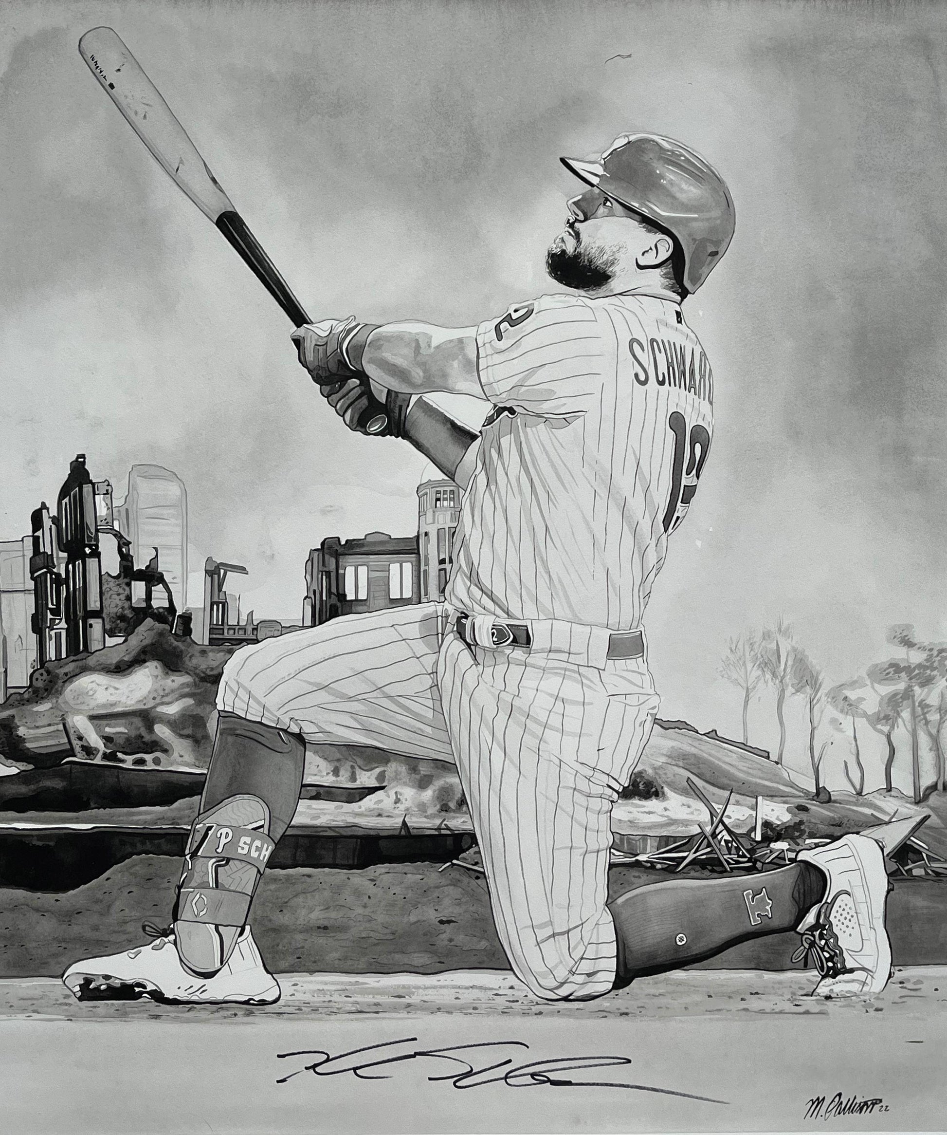 This original painting was finished and signed in 2022 by the mighty Kyle Schwarber. This is the original 1/1 painting on 300lb Hot Press Watercolor Paper.