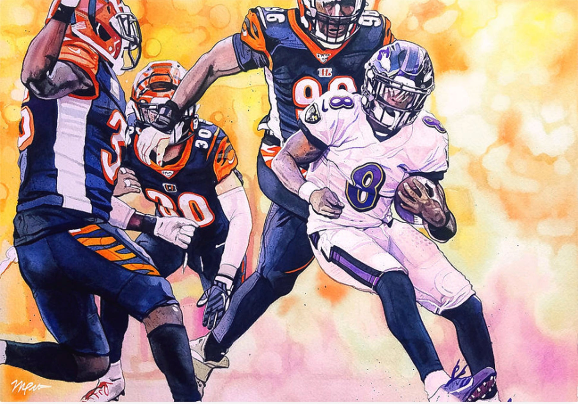 Celebrate one of Lamar Jackson’s most iconic moments with this expertly crafted watercolor print capturing his legendary spin move against the Bengals. Printed on premium rag watercolor paper, this artwork offers exceptional texture and durability, making it a standout piece for any Baltimore Ravens fan or sports art collector. The detailed brushwork and vibrant colors bring the dynamic motion of Jackson’s agility to life, perfect for display in your home, office, or sports gallery. Elevate your collection with this unique tribute to a true NFL talent.